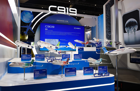在中國商飛展臺,集中陳列了1:32比例C909、C919基本型飛機模型,1:50比例C909衍生型及C919加長(cháng)型、縮短型飛機模型,1:100比例C929飛機模型,還展示了C919飛機可平躺的頭等/公務(wù)艙座椅等相關(guān)產(chǎn)品。